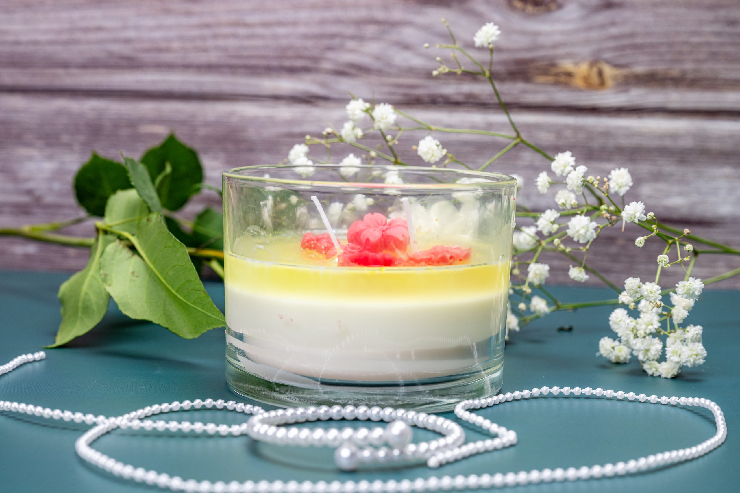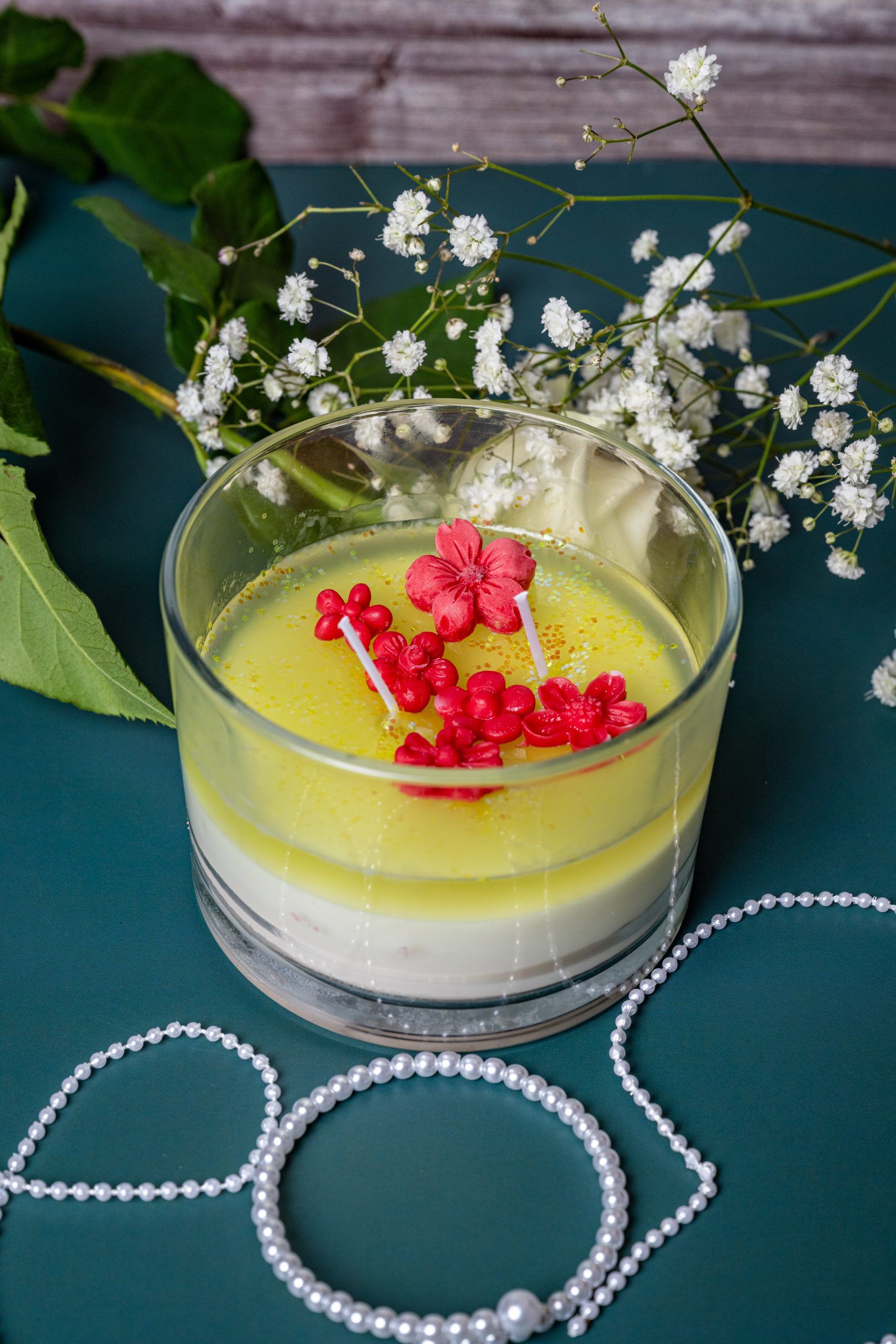 Fragrance: A radiant blend of citrus, amber, and sun-warmed florals Color Variant: Yellow and white Wax Type: Premium soy & jelly wax | 100% pure ingredients Design Theme: Celebratory / Wedding Capture the magic of sunset with Golden Hour, a luminous candle infused with sparkling citrus and golden amber .Topped with shimmering glitter and handmade floral embeds, this two-wick candle radiates joy, celebration, and warmth. It’s ideal for weddings, anniversaries, or any golden milestone worth honoring.